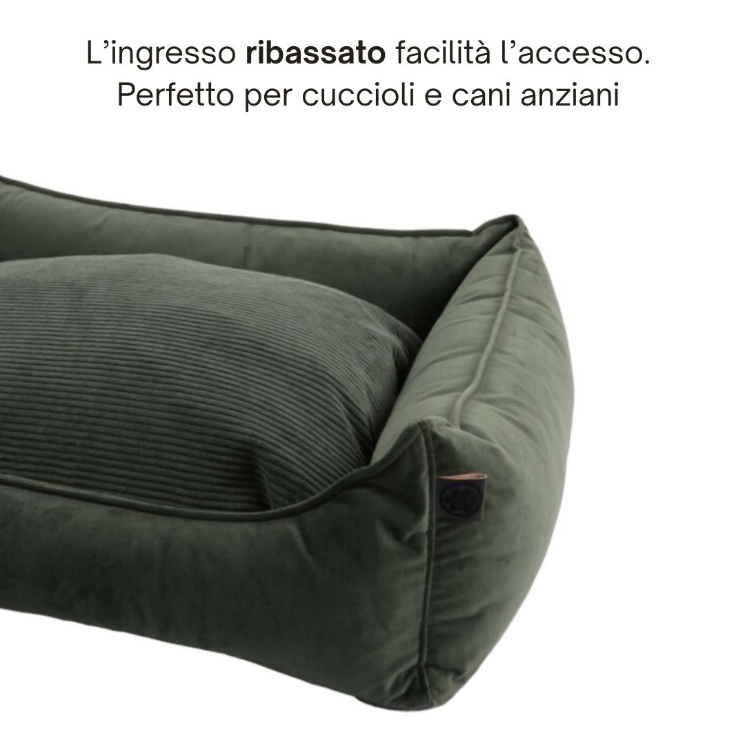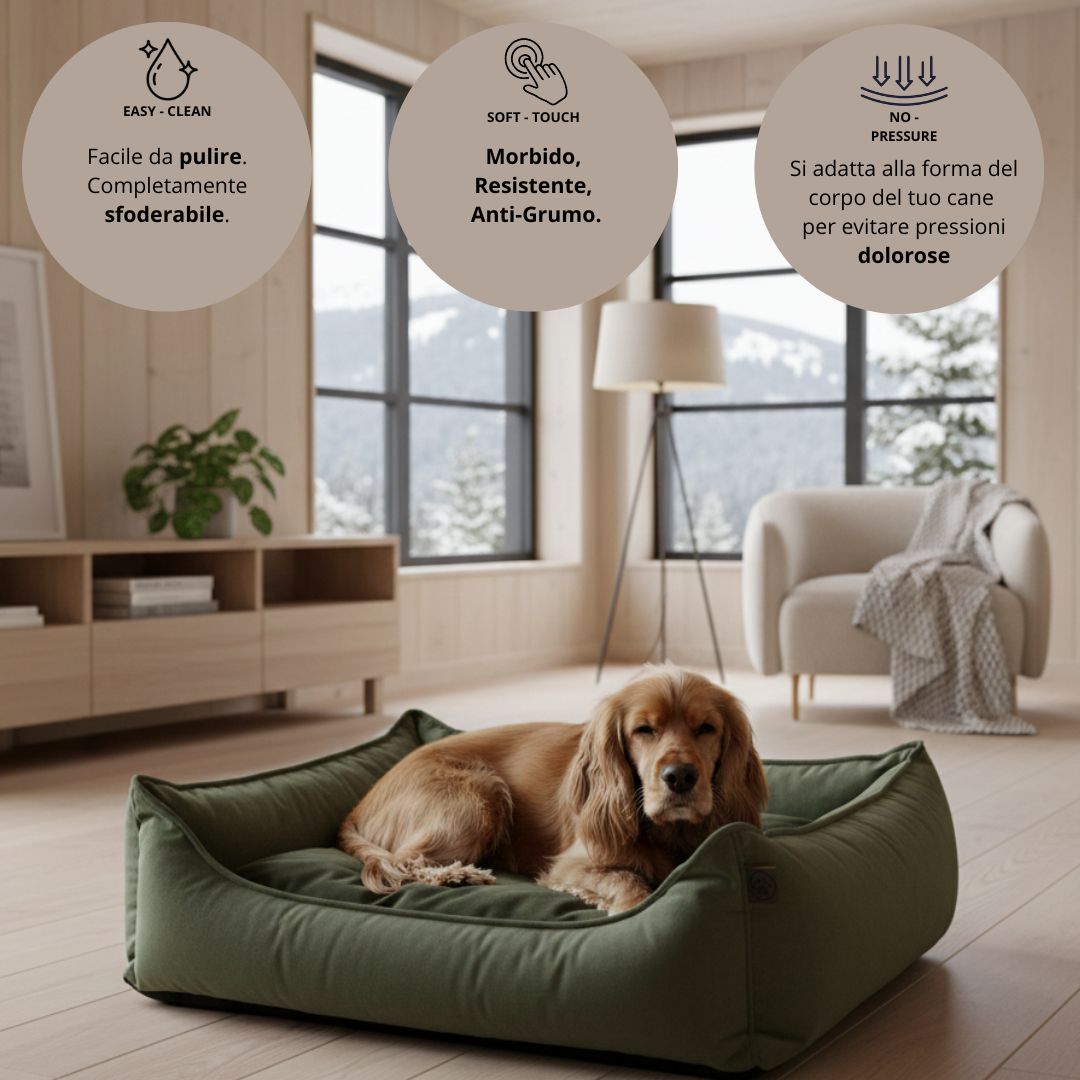 La cuccia per cani Overseas Verde Oliva offre una superficie morbida e accogliente che favorisce il rilassamento muscolare e il benessere quotidiano, garantendo un riposo naturale e confortevole.