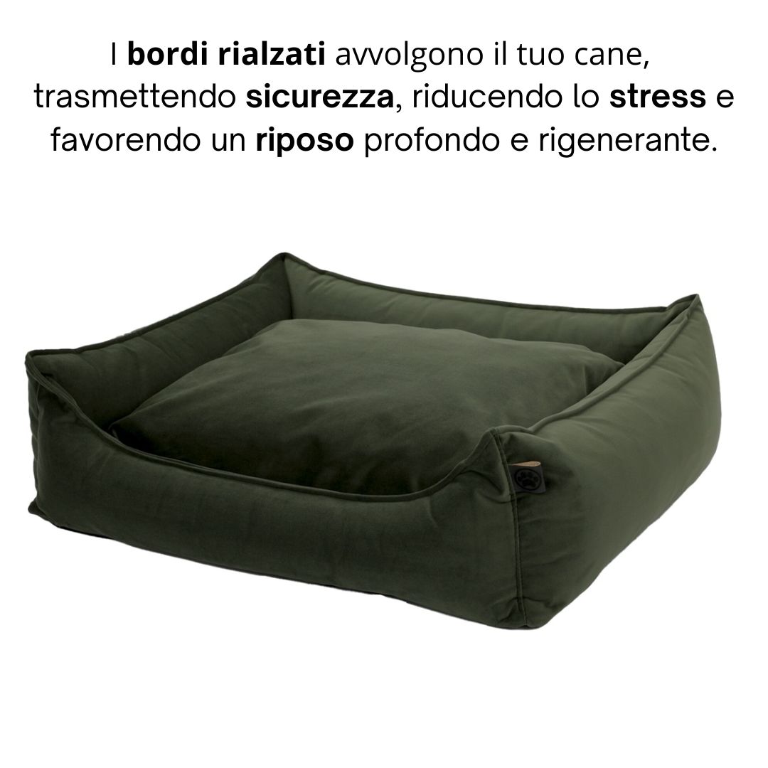 I bordi alti e imbottiti avvolgono il corpo del cane, creando una sensazione di rifugio che riduce lo stress e favorisce il rilassamento. Questa caratteristica è particolarmente apprezzata dai cani che amano sentirsi contenuti e protetti durante il riposo.