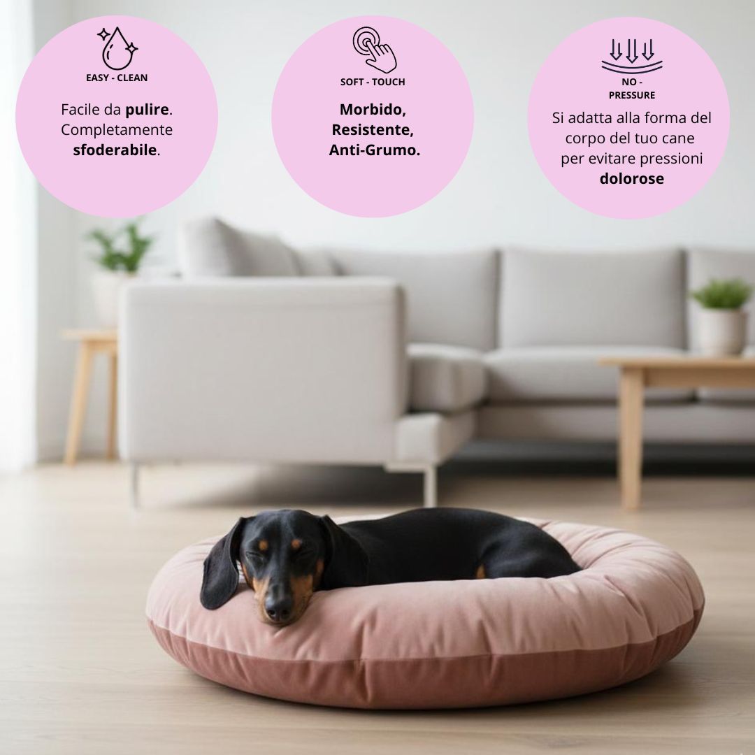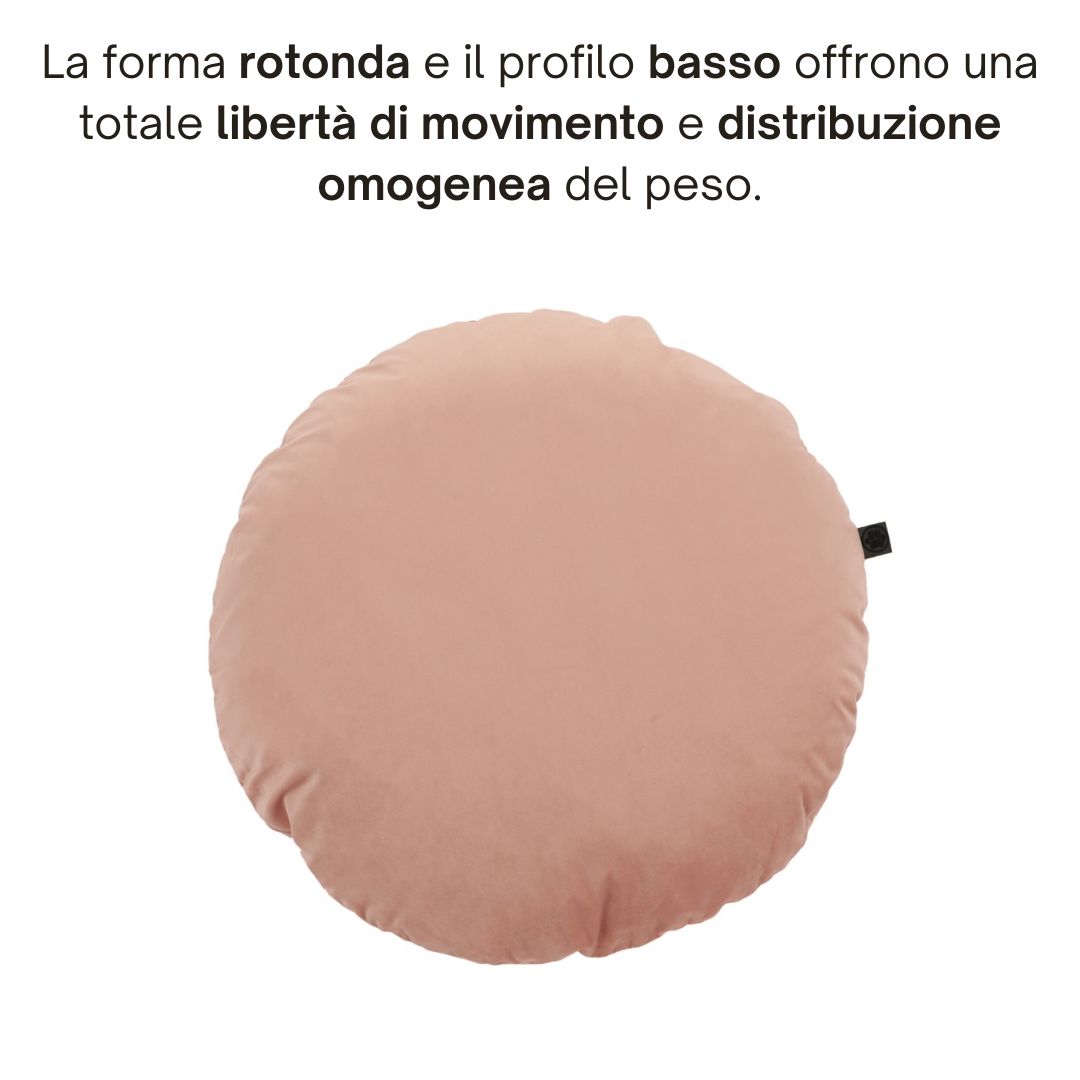 La forma rotonda tipo pillow e il profilo basso permettono al cane di muoversi liberamente, distendersi o rannicchiarsi nella posizione preferita, favorendo un riposo naturale e rilassato.