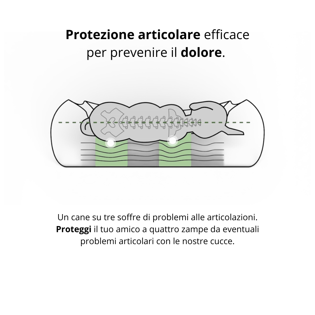 L’imbottitura segue la postura naturale del corpo del cane, distribuendo il peso in modo omogeneo e contribuendo a ridurre i punti di pressione durante il riposo.