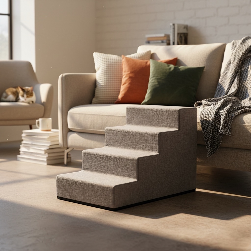 La Scaletta per Cani a 4 Gradini Comfort+ è progettata per offrire al tuo cane un accesso ancora più graduale e sicuro a letti alti, divani, poltrone o superfici rialzate, riducendo al minimo lo sforzo fisico e prevenendo movimenti bruschi o pericolosi.