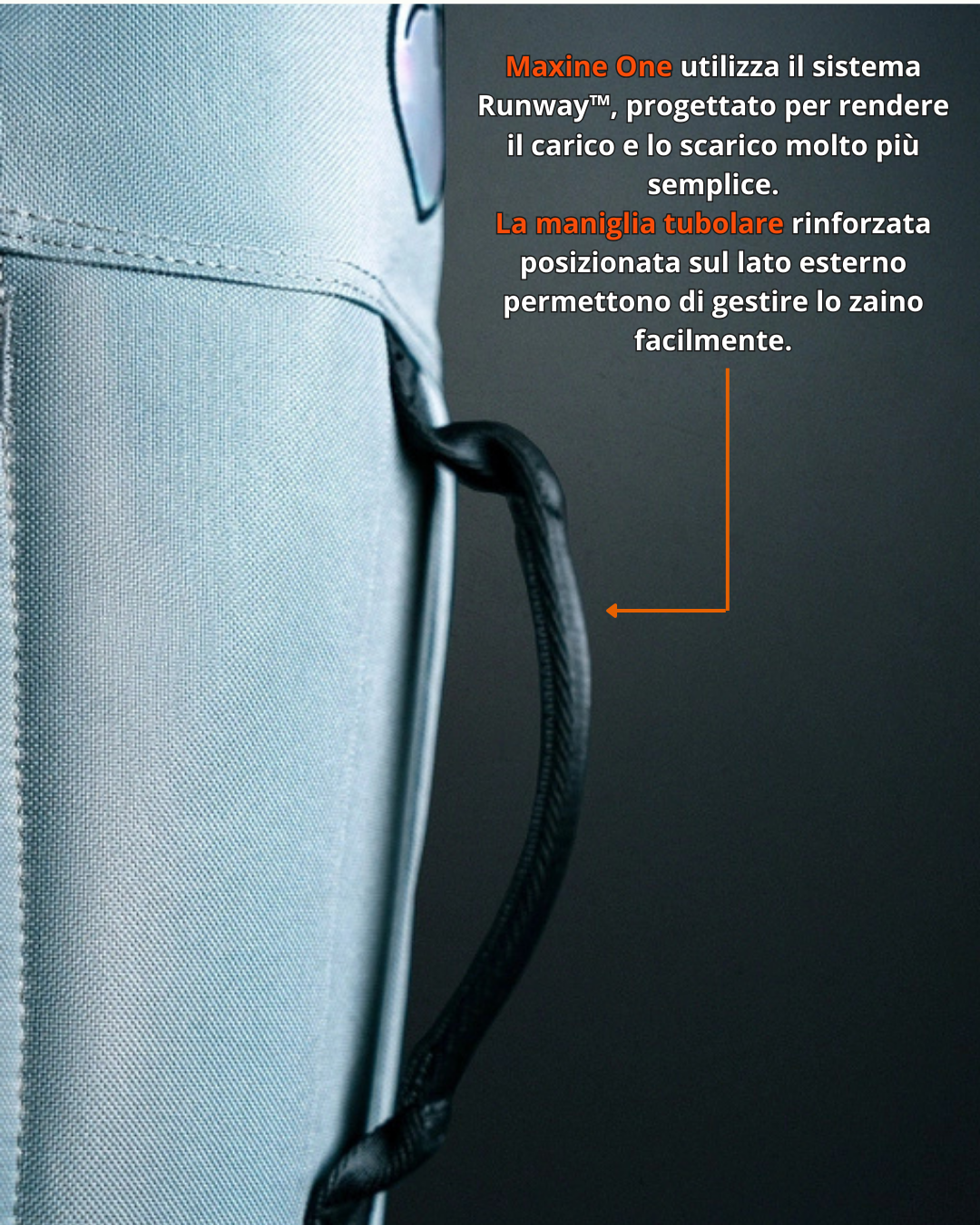 La maniglia tubolare rinforzata posizionata sul lato esterno dello zaino permette di caricare e scaricare il cane con il minimo sforzo e un maggior controllo.