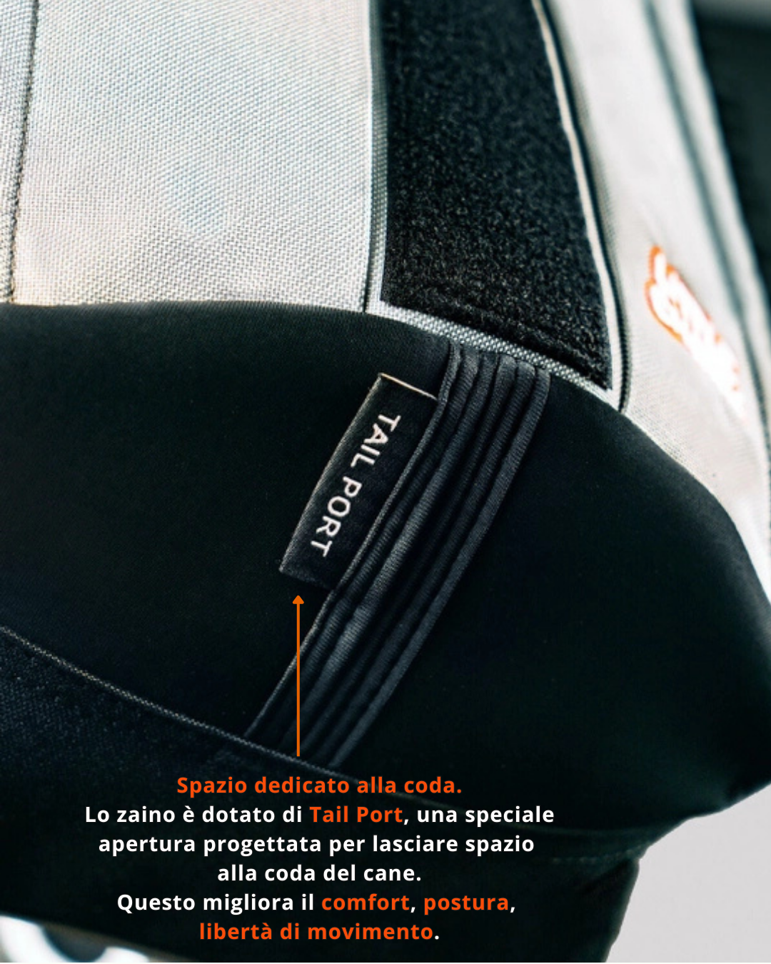 Lo zaino è dotato di Tail Port™, un’apertura progettata per lasciare spazio alla coda del cane.