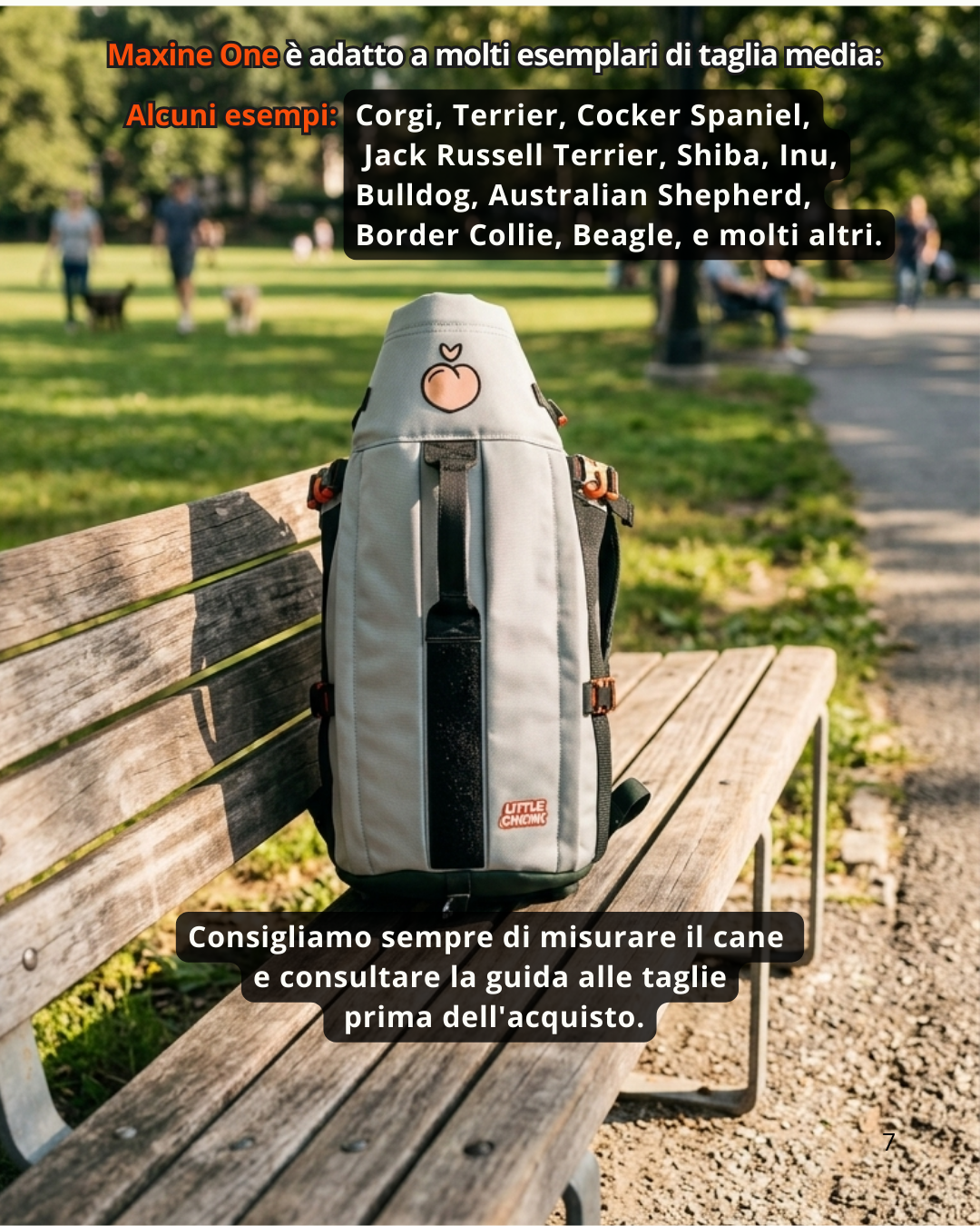 A differenza dei normali trasportini, Maxine One di Little Chonk™ è stato sviluppato con il supporto di veterinari e fisioterapisti canini, per favorire una postura naturale e ridurre lo stress durante il trasporto.